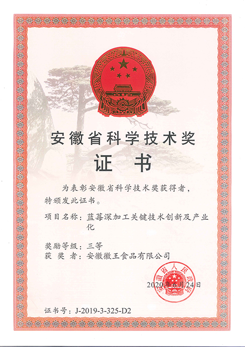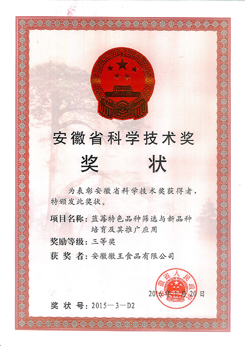 公司以科研院所為技術依托單位,并以政府政策為導向,大力發展特色精品農業、休閑觀光農業,先后在合肥與蕪湖建立了8個藍莓標準化種植基地,基地面積約4000余畝,直接受益農戶達3000多戶。并于2014年組建安徽省藍莓工程技術研究中心,主要從事藍莓種苗適生性篩選與新品種研究、標準化種植技術研究和藍莓精深加工產品的研發。良種‘徽王1號’、‘徽王2號’已通過主管部門認定;目前產品有藍莓干紅、果干、果汁、果醬、蜂蜜等。截止目前,公司制定國家標準1項、地方標準4項,獲授權發明專利19項,發表論文10余篇。