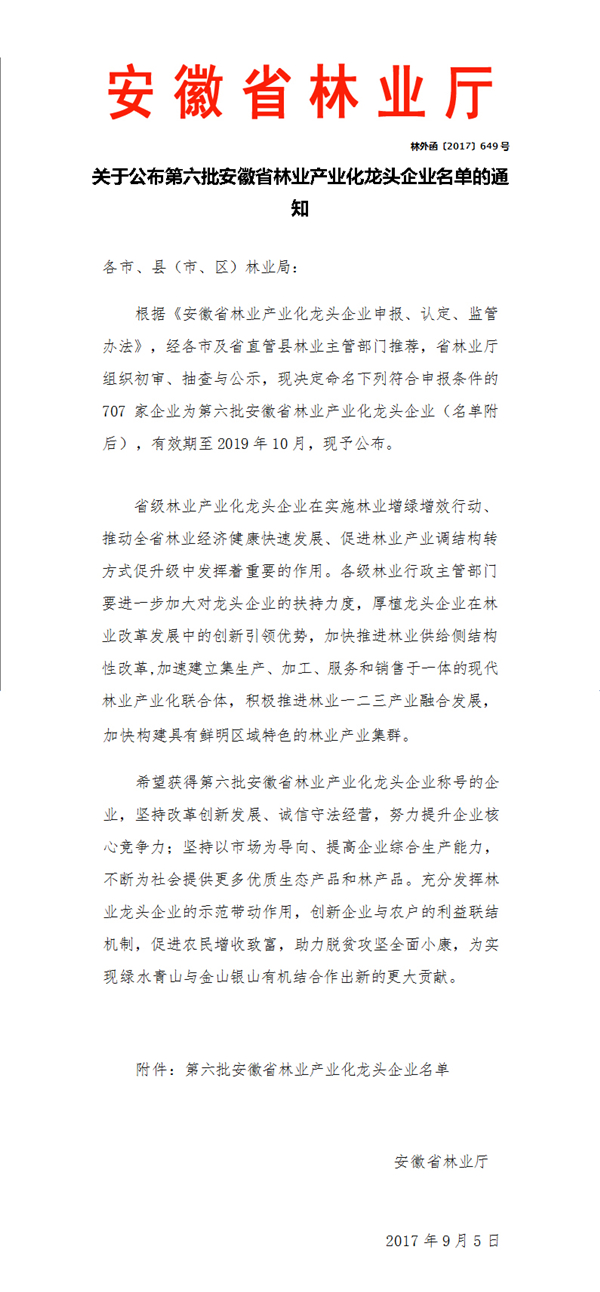 關于公布第六批安徽省林業(yè)產業(yè)化龍頭企業(yè)名單的通知